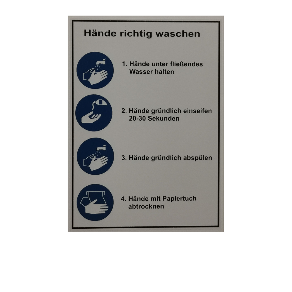 Aufkleber weiß mit schwarzer Schrift und blauen Schildern, 4 Punkte zum richtigen Händewaschen